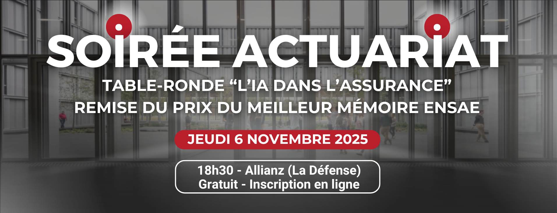 L'événement débutera à 18h30 avec une introduction de Maylis Coupet, Directrice de l'ENSAE Paris, suivie de la table-ronde puis de la remise du Prix du meilleur mémoire d'actuariat ENSAE Paris, et se poursuivra par des échanges autour d'un cocktail de clôture.